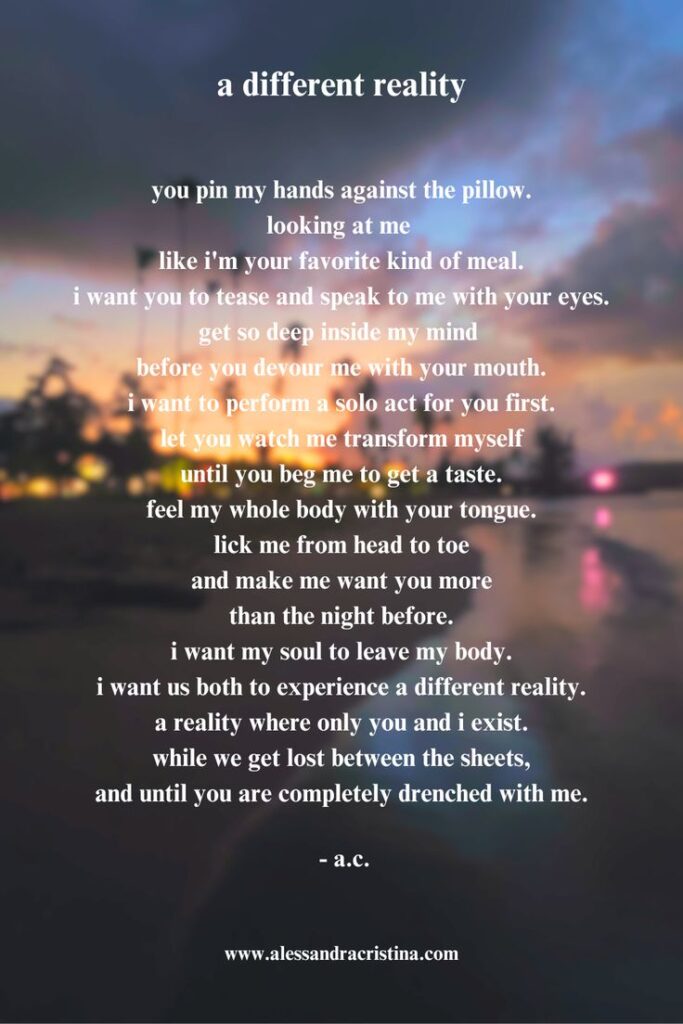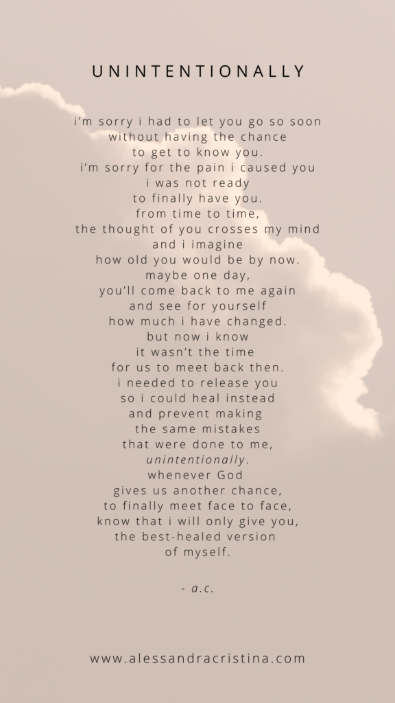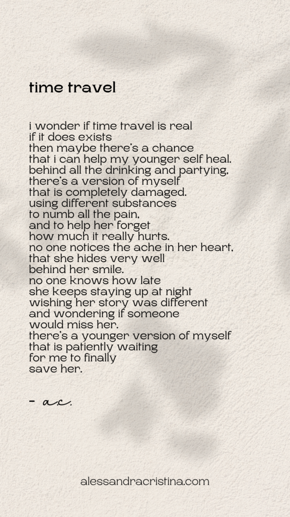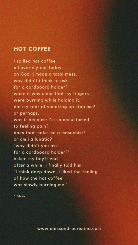 hoy, después de treinta y dos años por fin me senté conmigo misma y me dije cosas que necesitaba oirlás. me pregunte, ¿por qué me destrozan las personas que amo? ¿por qué no ven todo el daño que me han causado? ¿acaso no soy suficiente? ¿o es que hay algo en mí que está ausente? solo quiero ser amada. solo quiero ser vista. pero cada vez que abro mi corazón, siempre termino con heridas. ¿cuál es el sentido de la vida? si cada vez que creo que por fin, encontré a la persona para mi, terminan llevándose, una gran parte de mi. me siento vacía por dentro, como que quiero llorar todo el tiempo. para por fin sanar heridas que llevo conmigo, desde que tenía doce años de vida. ella me miro, con una sonrisa en su cara susurro. querida, ¿dónde has estado? ¿no ves que soy todo lo que has buscado? eres más que suficiente, y si, lo que has vivido ha sido muy fuerte. siento mucho por todo ese dolor que te han causado. fueron ellos los que no te valoraron. pero ya puedes por fin dejar ir ese dolor, que has cargado contigo en tu corazón. y por fin ver que ese gran amor que tanto has buscado, siempre ha vivido a tu lado. - Alessandra Cristina © all rights reserved